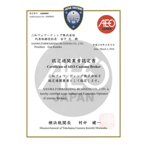 In March 2016, we were approved by Yokohama Customs as a “Certified customs broker” under the AEO system, and we provide services that take advantage of the convenience of an AEO business, such as easing and simplifying customs procedures.
